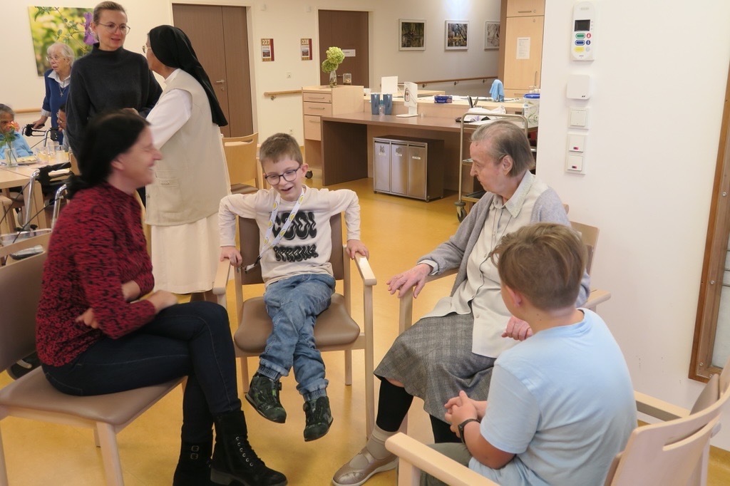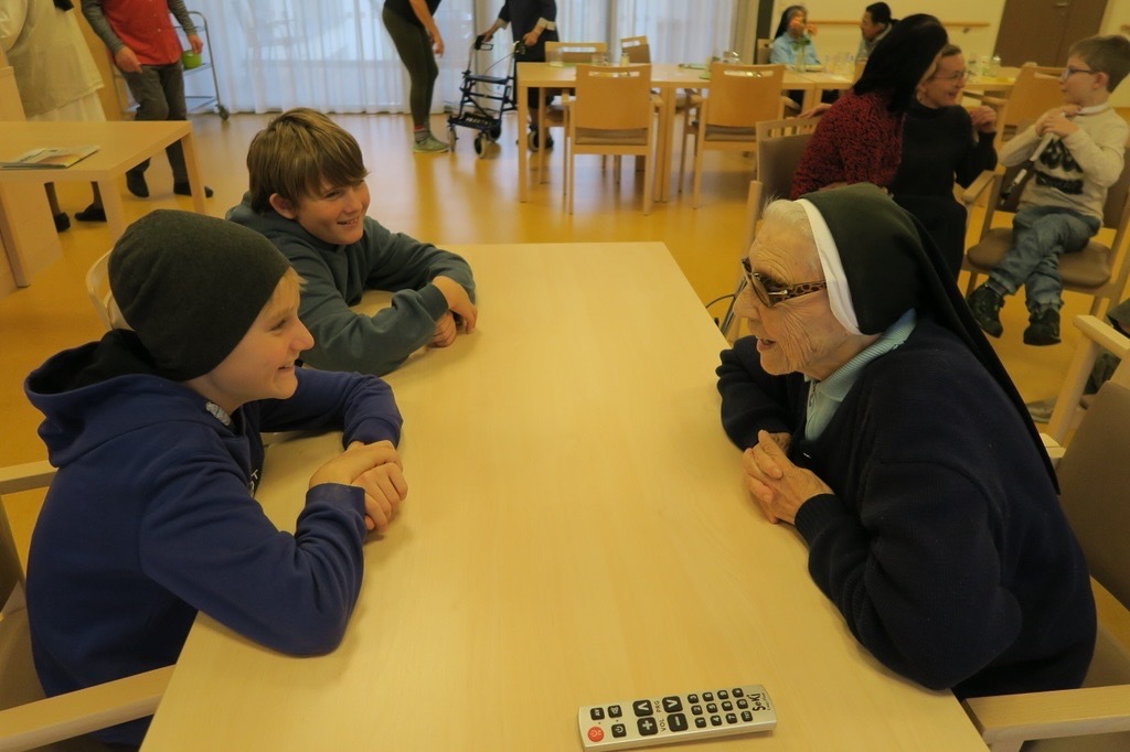 Wir nutzen die sogenannte „Focus-Zeit“ am Dienstagvormittag zum Besuch dieses Hauses und nehmen uns Zeit für Gespräche mit den Bewohner:innen. Unter ihnen befinden sich auch die pflegebedürftigen Schwestern vom Guten Hirten. Wir reden über heute und damals, spielen gemeinsam Spiele oder unternehmen einen kurzen Spaziergang im Garten.