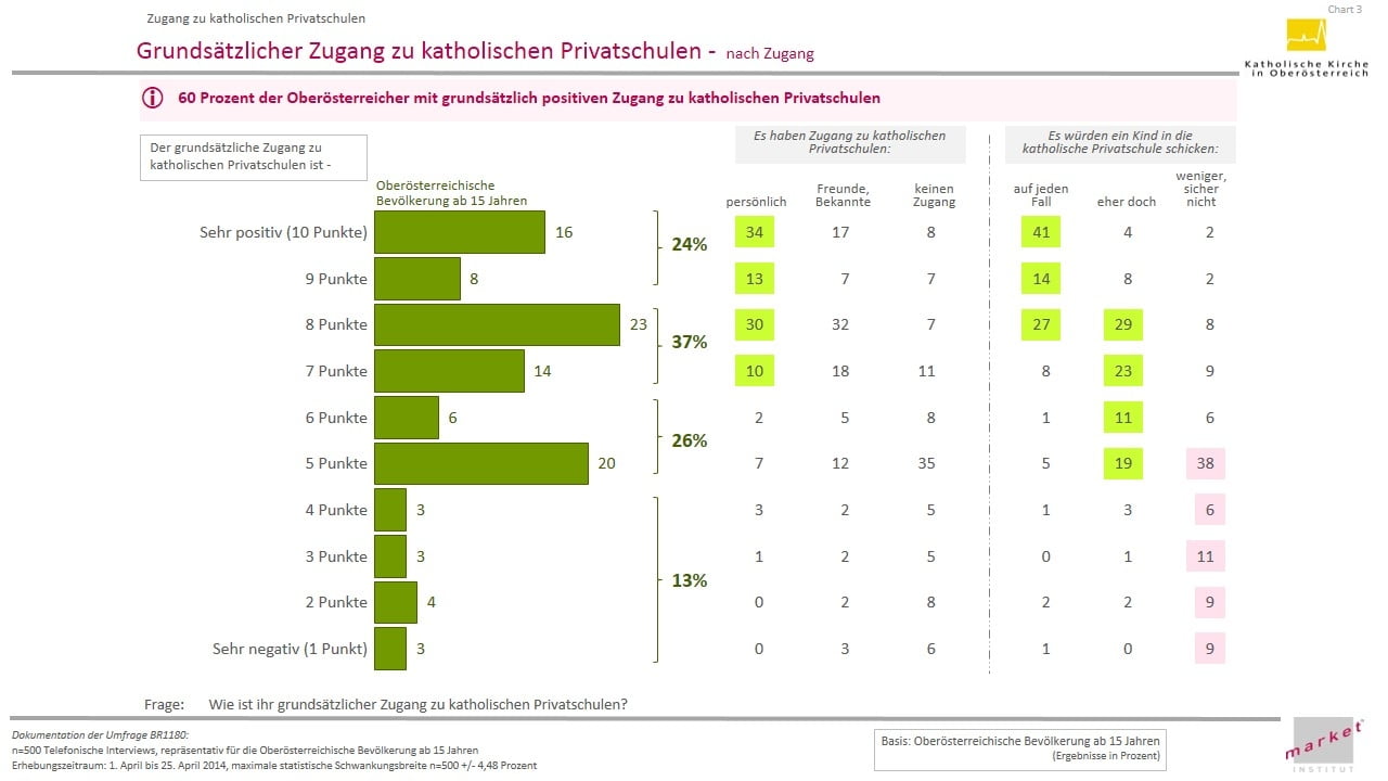 Die sehr differenzierte Sicht der Oberösterreicher/innen auf das katholische Schulwesen ermöglicht es den Verantwortlichen an den katholischen Schulen, über die konkrete Arbeit nachzudenken und ihr Profil zu schärfen. Sie ist gleichzeitig Bestätigung und Auftrag, die pädagogische Arbeit an der Lebenswelt und den Bedürfnissen der Kinder und Jugendlichen von heute auszurichten.