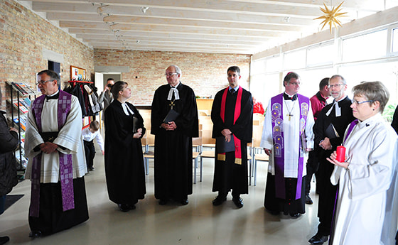 Am Beginn des Gottesdienstes begrüßte Hausherr Pfarrer Ortwin Galter mit den Bischöfen Manfred Scheuer und Michael Bünker die Delegationen der drei Gast-Gemeinden, die sternförmig in die Versöhnungskirche eingezogen waren. Nach der liturgischen Eröffnung brachten VertreterInnen der vier Gemeinden vier Kerzen zum Adventkranz, der ein sogenannter „diakonischer Adventkranz“ war: Statt vier Kerzen konnten 20 Kerzen gezählt werden, die nun um die vier „Sonntags-Kerzen“ ergänzt wurden. „Diakonisch“ heißt der Kranz deshalb, weil er vor über 170 Jahren in der ersten Einrichtung der evangelischen Diakonie erfunden wurde. Der evangelische Theologe und Pädagoge Johann Hinrich Wichern betreute in Hamburg arme Kinder im sogenannten „Rauhen Haus“, einem alten Bauernhaus. Um ihnen die Wartezeit auf Weihnachten zu verkürzen, baute er aus einem Wagenrad einen Holzkranz und machte mit Hilfe von 24 Kerzen (vier große für die Sonntage, 20 kleine für die Wochentage) einen Kalender daraus. Aus diesem entstand der heutige Adventkranz.